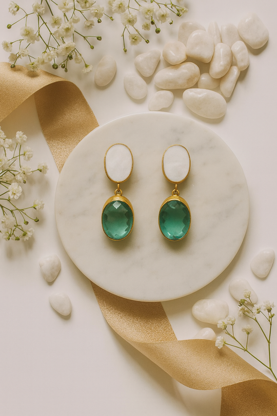 Add a touch of sophisticated color with these gold-plated drop earrings from House of Raasya, featuring luminous white ovals and striking green gemstone drops. These elegant earrings blend classic oval shapes with a modern, minimalist style...Sale price Rs. 1,699.00Regular price Rs. 2,999.00