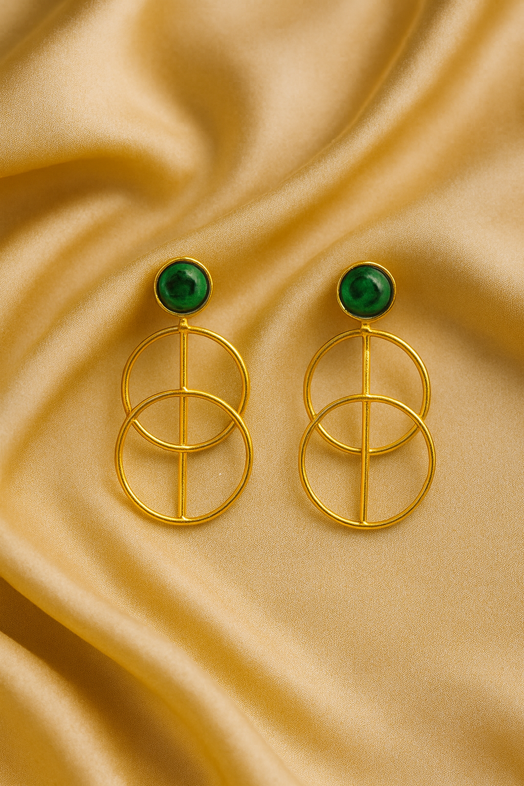 Sophisticated and bold, these geometric brass earrings feature a deep green stone stud with an elegant double-circle frame. Their handcrafted design exudes modern minimalism with a pop of color, making them the perfect accent for both festive and everyday outfits.